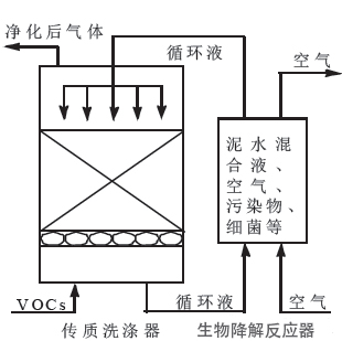 生物洗滌器(下圖)反應(yīng)條件溫和、操作穩(wěn)定;但其運行成本高,處理的VOCs 需要易溶于水。